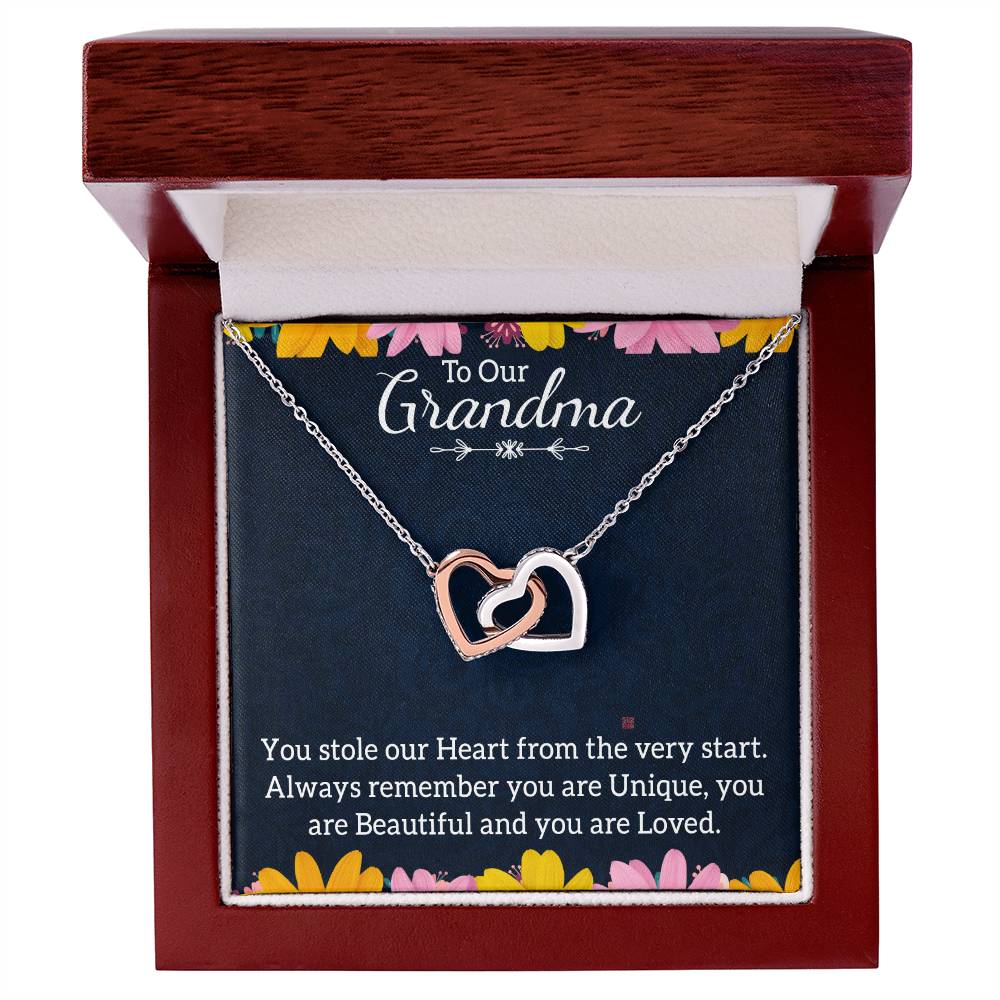 To Our Grandma You stole our Heart From the Very start Interlocking Hearts Necklace (Yellow & White Gold Variants)
