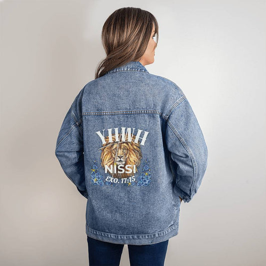 Oversized Women's DTG Denim Jacket The Names of God YHWH-Nissi The Lord My Banner